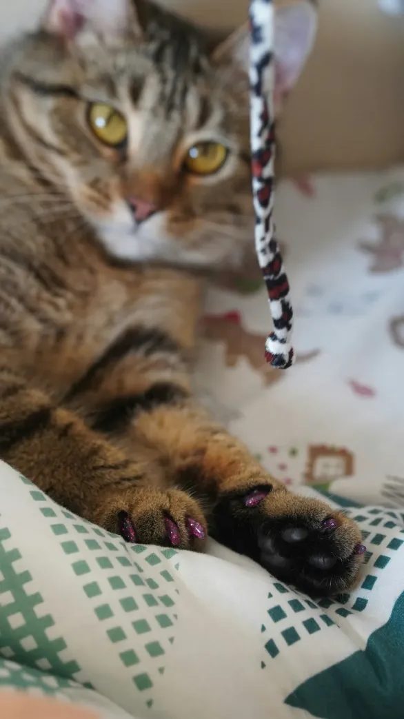 Kitty gets a nail clipping plus a set of soft paw nail caps (available in a variety of colors) for their front paws.